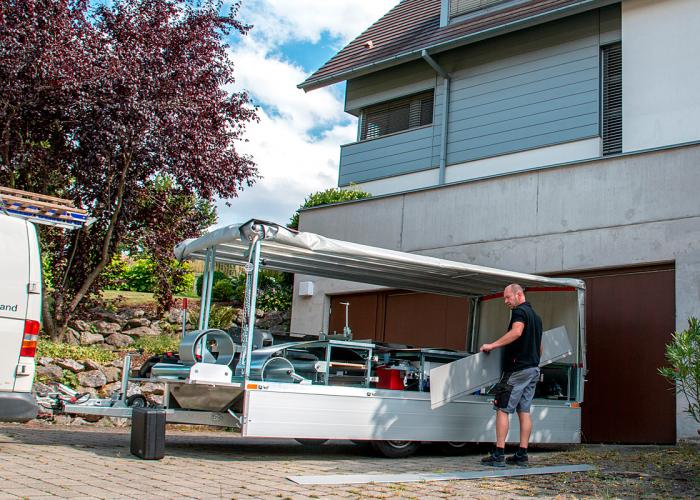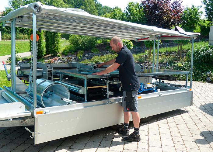 Díky dobře řešené konstrukci pojízdné dílny je možné jednoduchou manipulací vytvořit přístřešek a tím je možné pracovat téměř za každého počasí.