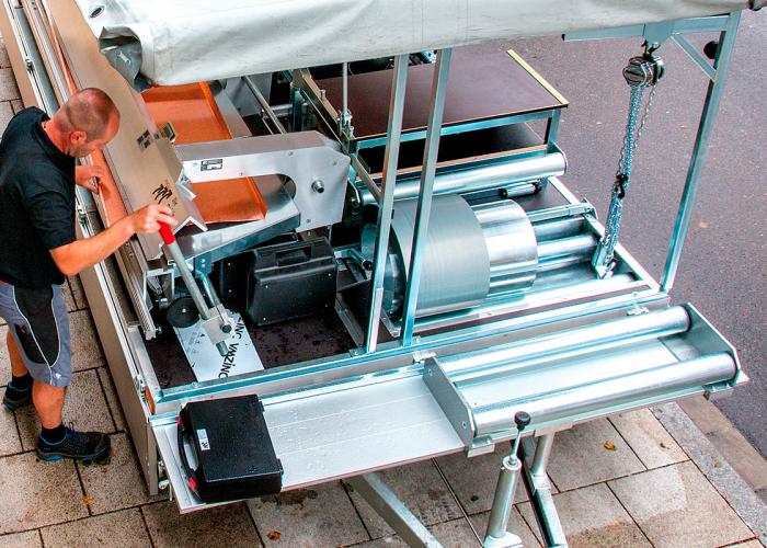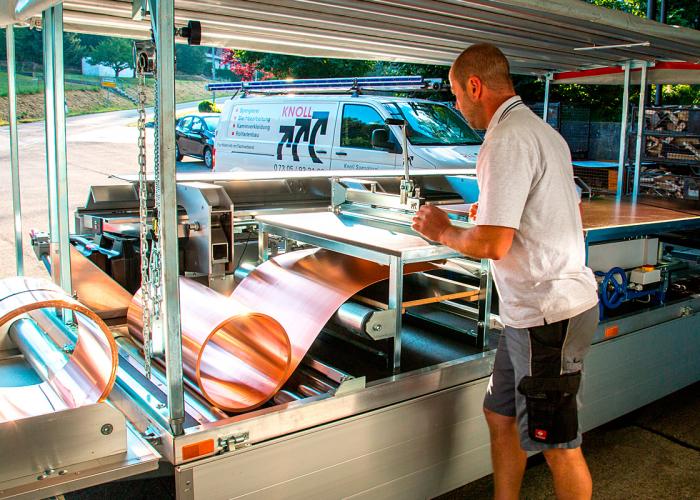 Vybavením dílny profilovacím strojem Schlebach MiniProf se klempířská dílna rozšíří o další možnosti a stává se tak plnohodnotnou dílnou. Pro úsporu místa je stroj zabudován v prostoru pod pracovním stolem. Při profilování se deska pracovního stolu odklopí a pro odkládání naprofilovaných plechů se vysune konstrukce stolu.